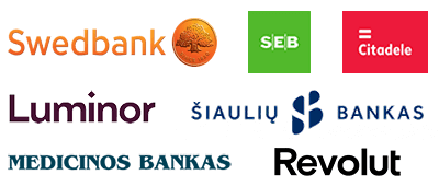 Atsiskaityti galima naudojantis SWEDBANK, SEB, LUMINOR, CITADELĖ, ŠIAULIŲ BANKAS, URBO, REVOLUT bankininkystės paslaugomis.